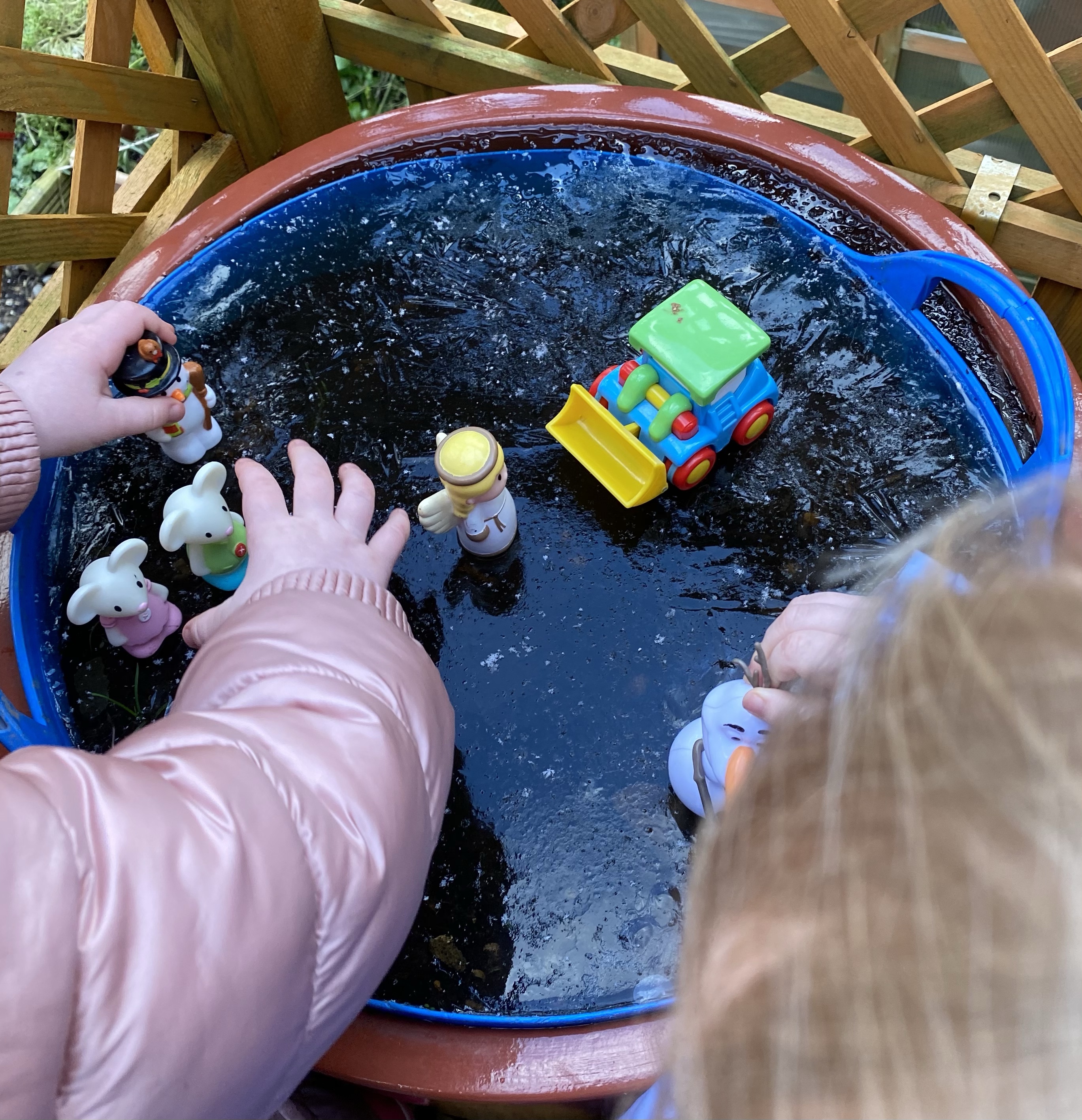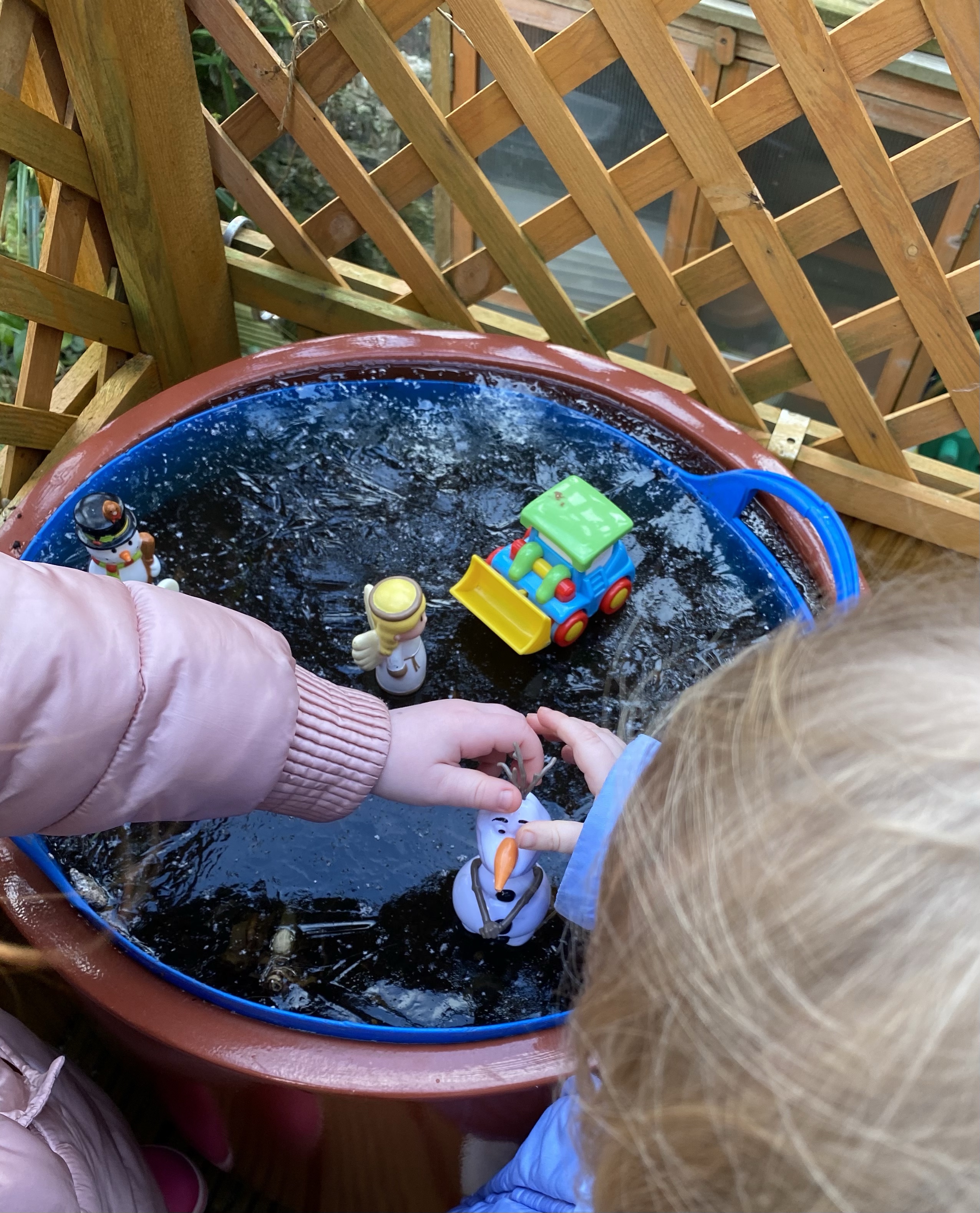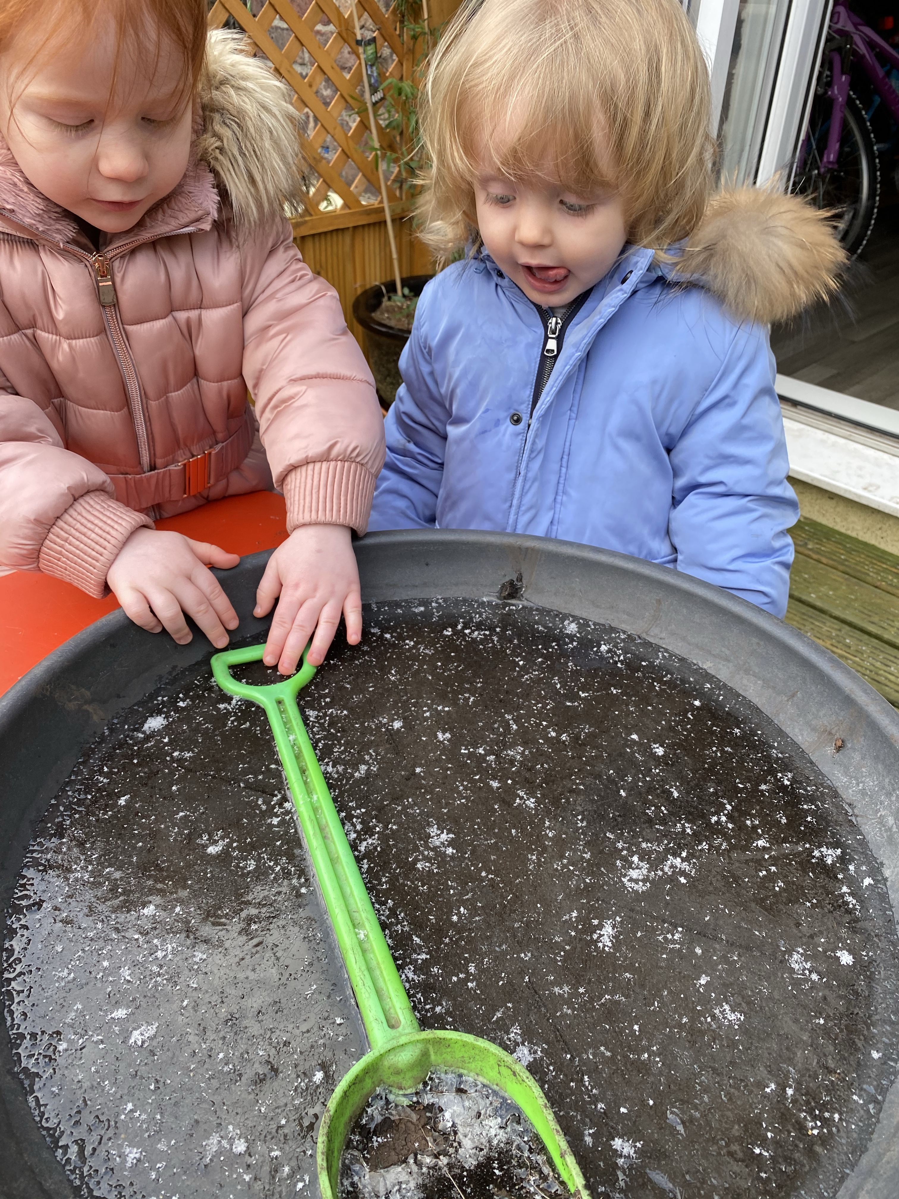 On our walk around the garden today we found everything had turned to ice! Theo pointed to the spade and Fearne tried to pick it up. When we carefully moved the spade we saw it had left a print in the ice in the shape of a spade!