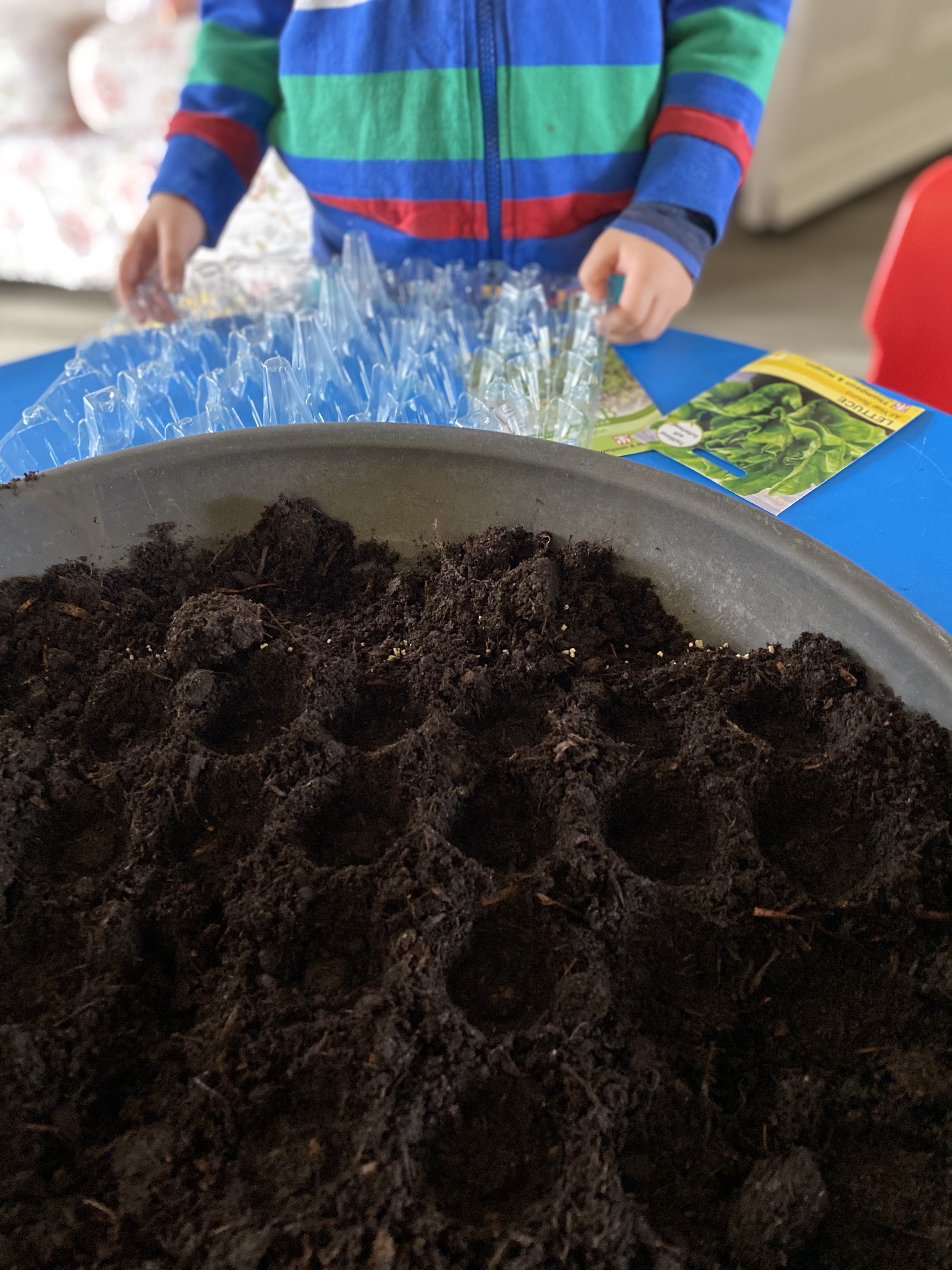 It was wet and windy today so we decided to stay indoors to sow our seeds. We used items out of our Recycling bin to fill up with soil and sow the seeds.