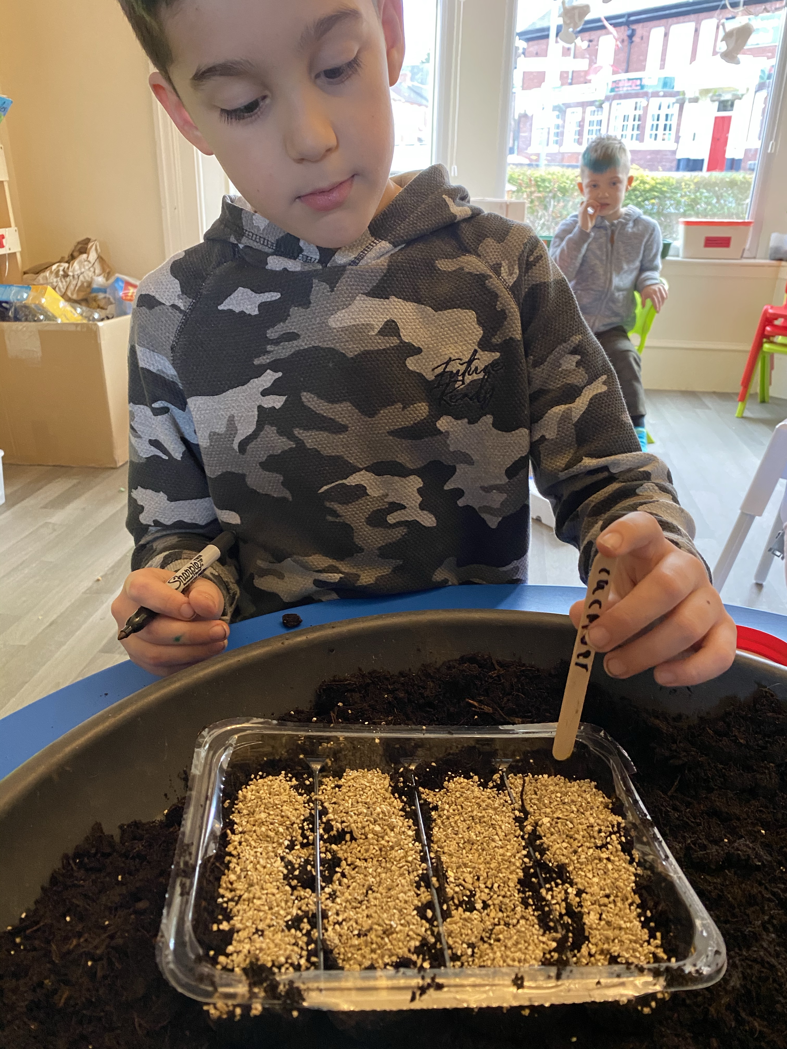Martha found this egg box and said she thought it would be good to sow individual seeds. Ivor said we might be able to see the roots grow too! The children loved the marks the egg box made in the soil.
