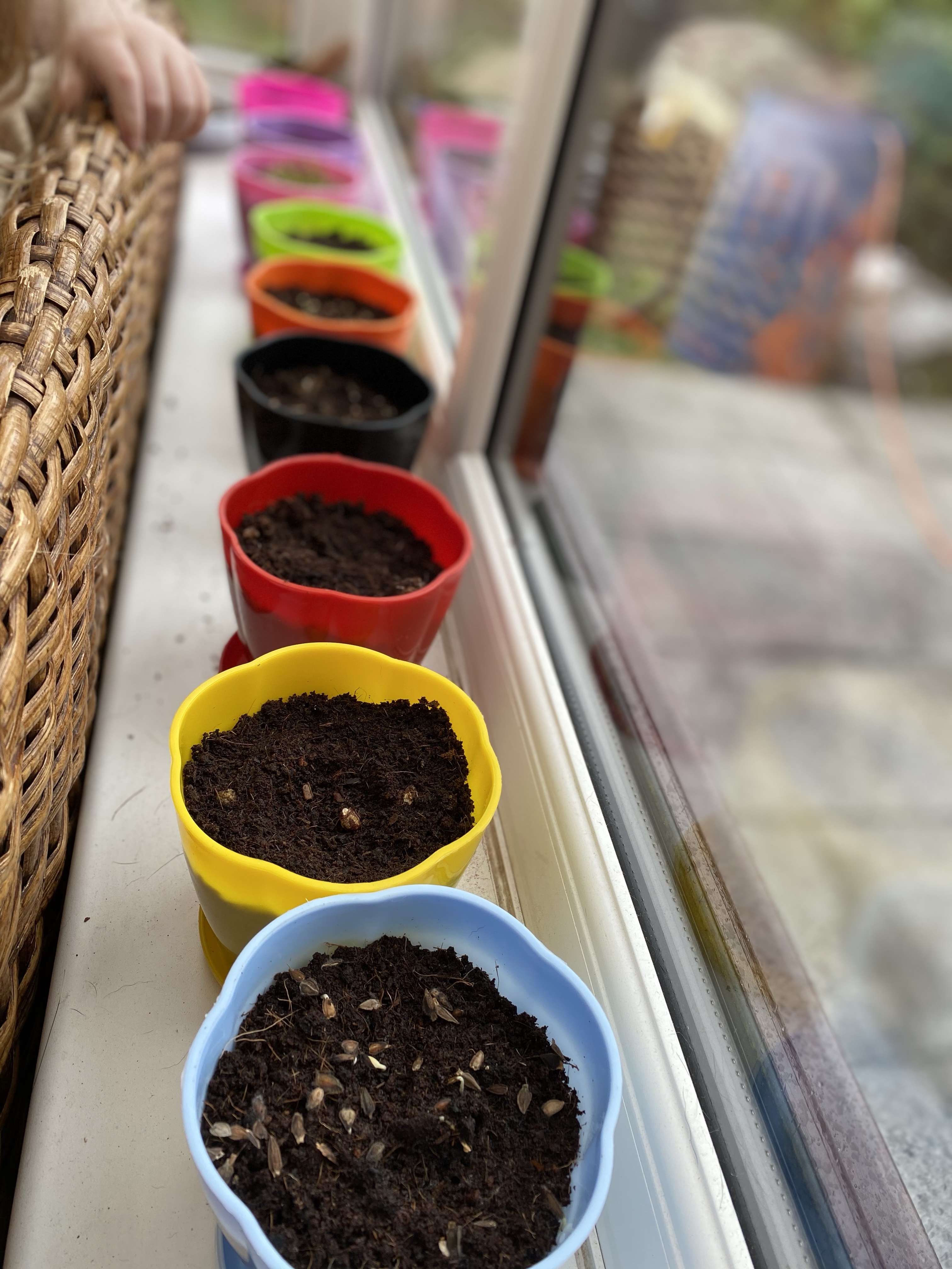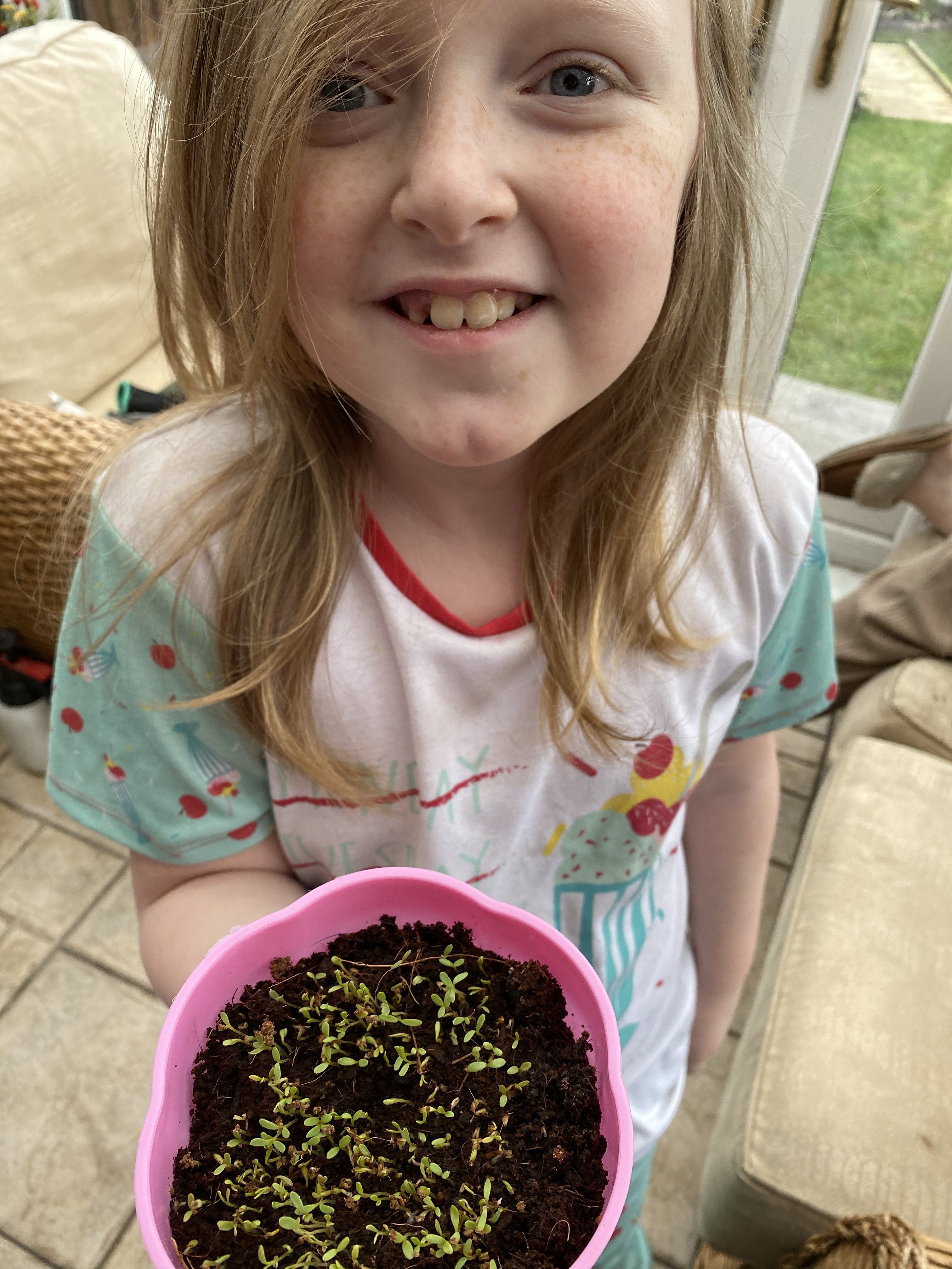 Chloe has been busy with her growing plants. The Pink pot has won by having seedlings growing well!