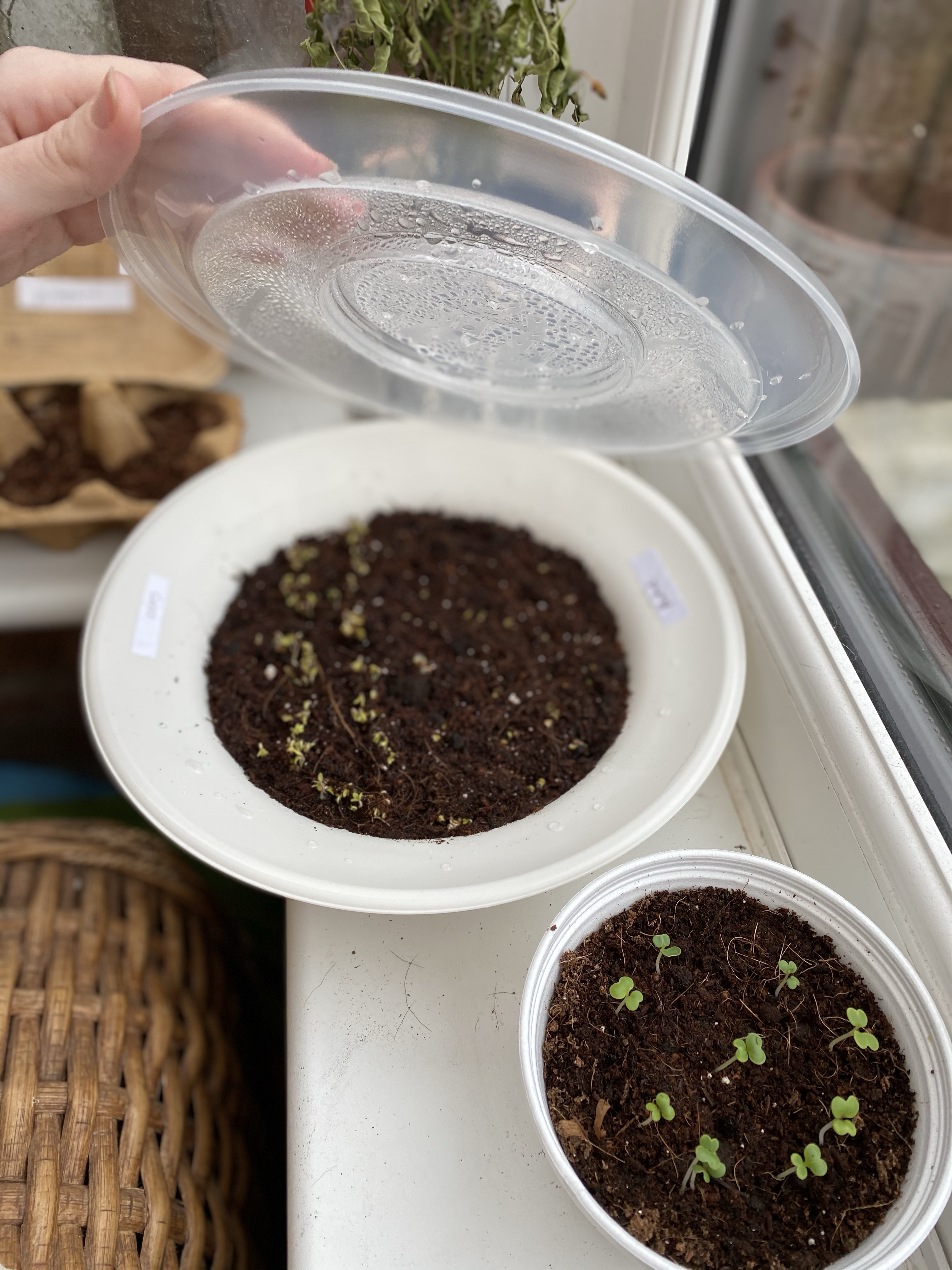 After a week, the seeds have started to grow. The lid of the meal dishes make a great ecosystem keeping them self watered.