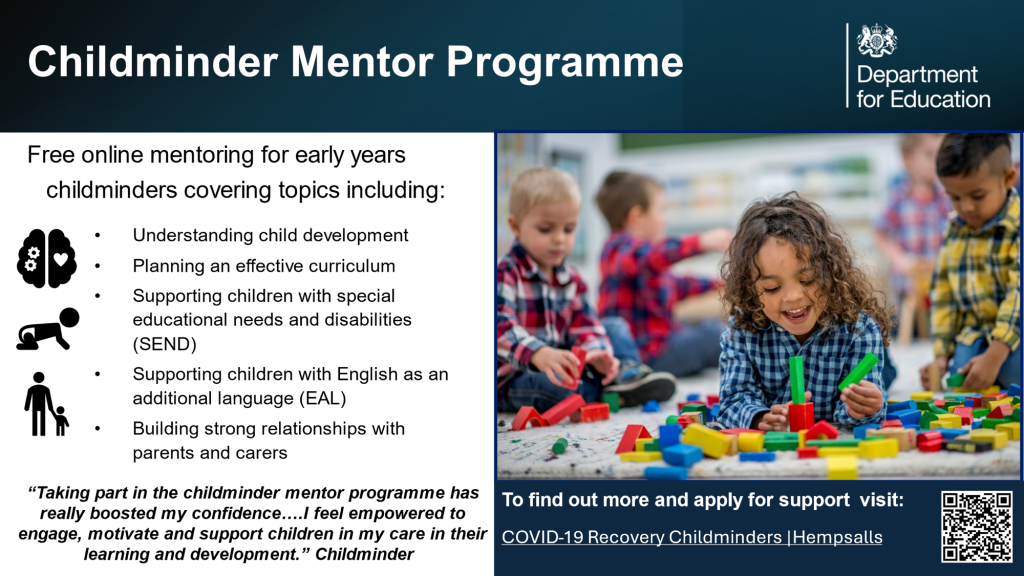Posted in Uncategorized DfE Childminder Mentor Programme Image• Posted on 21st Mar 202423rd Mar 2024 by Tracie Dowling Share this: Click to share on X (Opens in new window) X Click to share on Facebook (Opens in new window) Facebook Like Loading... Related Author: Tracie Dowling I have worked in childcare for over thirty years. I have been a Foster Care Parent, a Childminding Network Co-Ordinator and now I work as a Registered Childminder and Childminder Mentor for the Department for Education. View All Posts