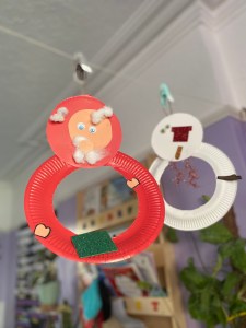 We used paper plates for the bodies of the snowman and Father Christmas, cutting out the head from the middle of the plate. we added his facial features, body parts using foam, goggly eyes, card, cotton wool, pens and lots of glue.