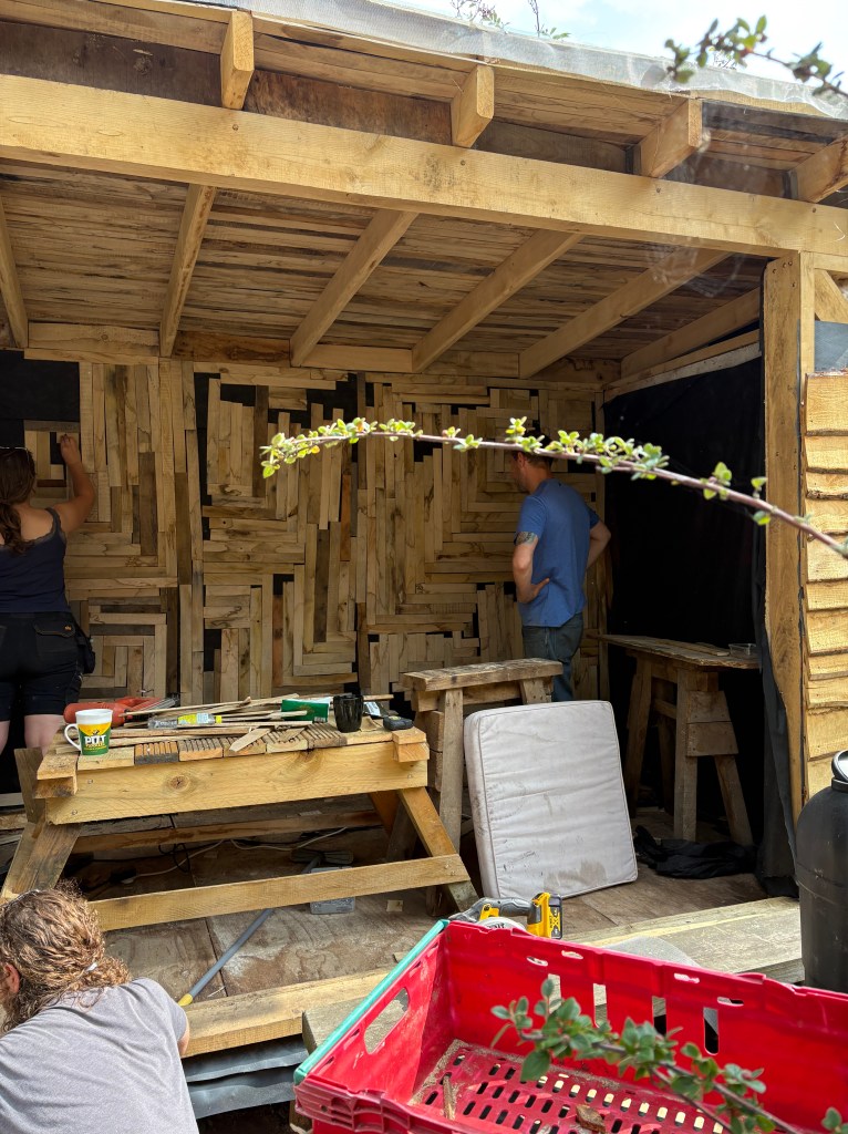 The walls have been insulated and covered in recycled wood, creating a warm and inviting atmosphere, while also highlighting sustainable resources. The mosaic textures of the walls add a unique aesthetic appeal, each piece telling its own story of reclaimed craftsmanship. They even made a stunning table out of reclaimed decking, showcasing the beauty of upcycled materials, inviting friends and family to gather around for memorable meals and conversations. This commitment to environmental responsibility not only enhances the living space but also serves as a testament to creative design that respects our planet.