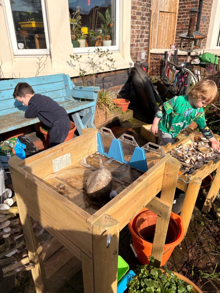 • Waterfall Sculpting: For a messier experience, we added sand to the base. The Children can use the falling water to wet the sand, then use shellsand pinecones as natural stamps or decorations for “sand mud pies”.