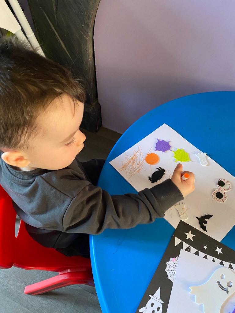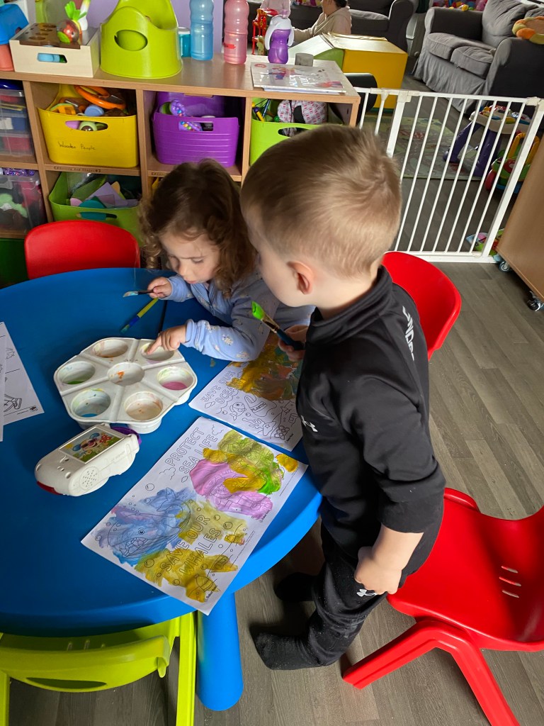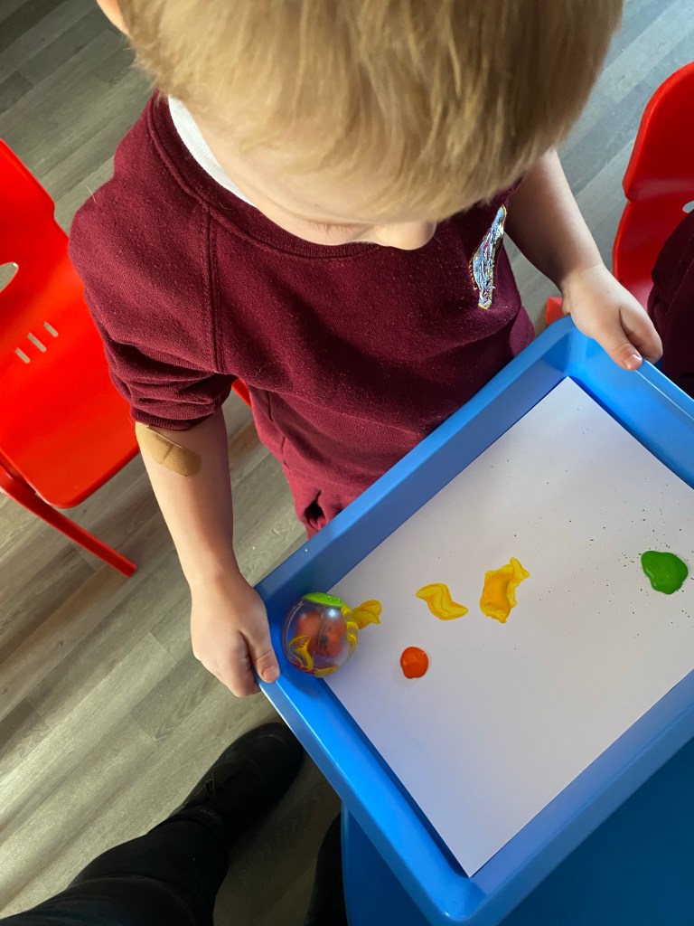 We started our crafts by making a Christmas wreath. All the children made green hand prints, except for Elliott, he doesn’t like getting his hands messy. Elliott painted a green picture instead and we cut out shapes to add to the plate.