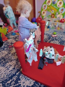 In the afternoon while the babies were sleeping, the older children asked to take the tent outside to play with. This extended their play and we talked about being in the tent through the seasons, at first they thought it would be fun to be in the tent when it was snowing. I asked them how would they keep themselves warm? They all said they would wear coats, hats and scarfs. I said they would have to wear them all the time so they thought it might not be so fun after all.