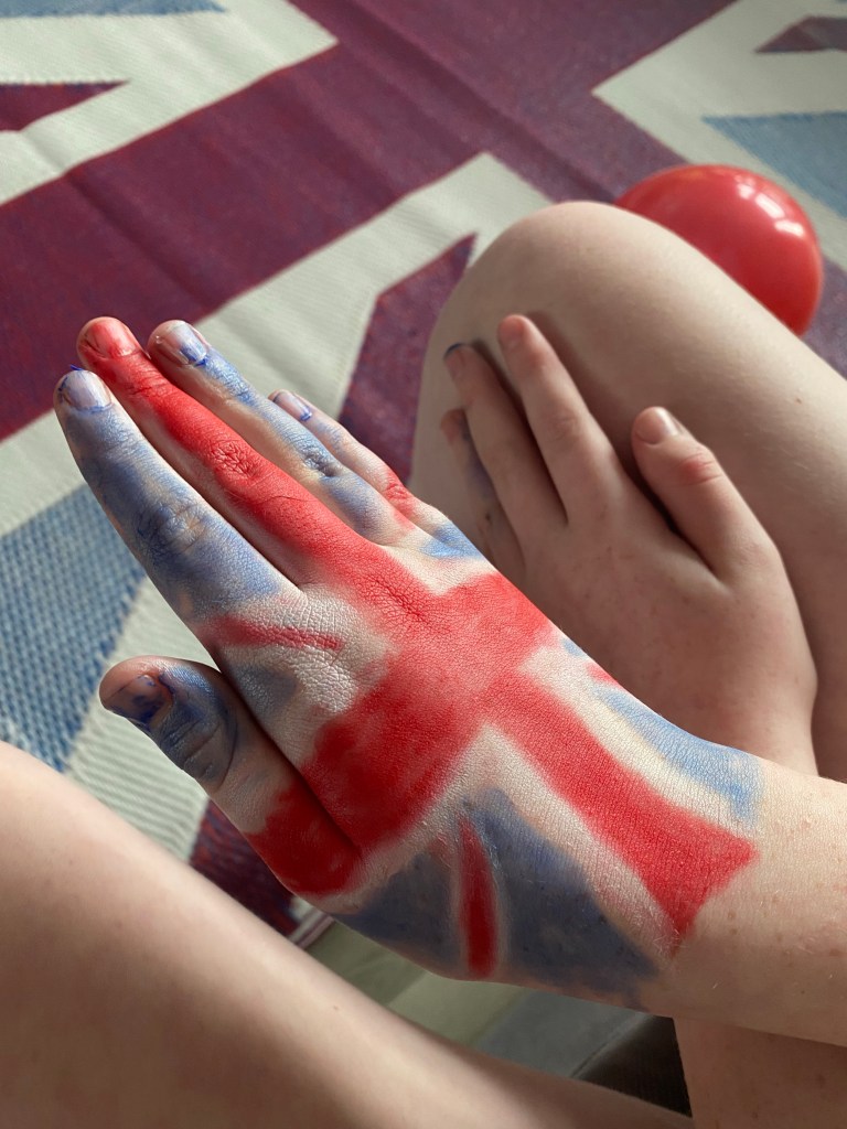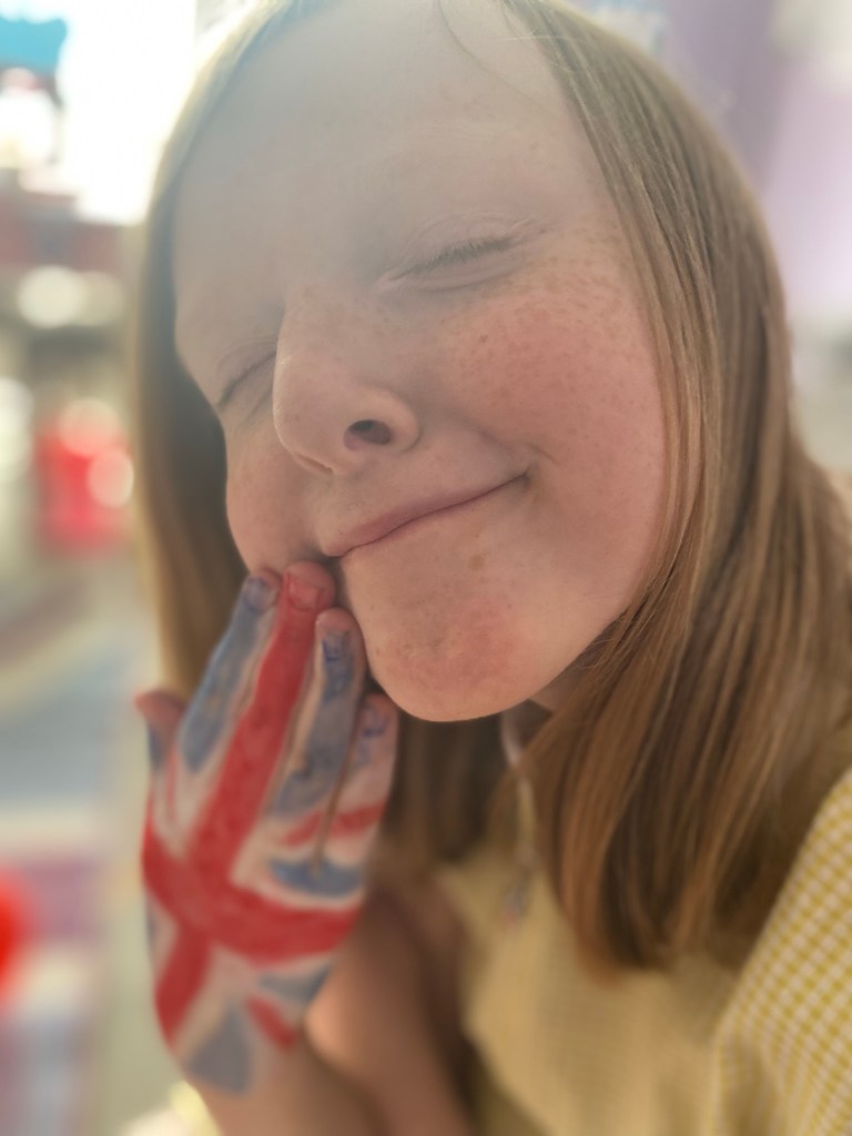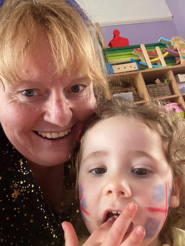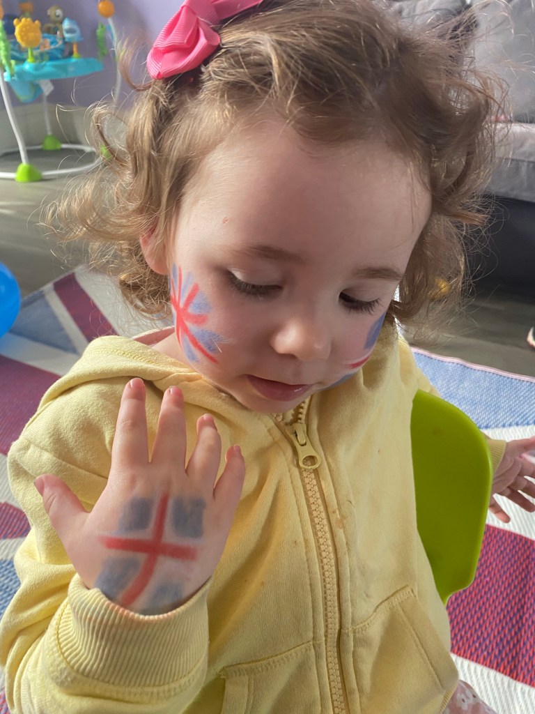 before school the wonderers and Rangers joined in and made some crafts before school. They had a non school uniform day to celebrate, so Tracie painted flags on their hands and faces and made Coronation dress up for them to wear.
