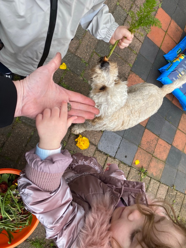 This week we have potted up our tomatoes ready to take home and plant in our own gardens, in pots on our patio’s. Alba came for a visit, she took one home for her new garden.