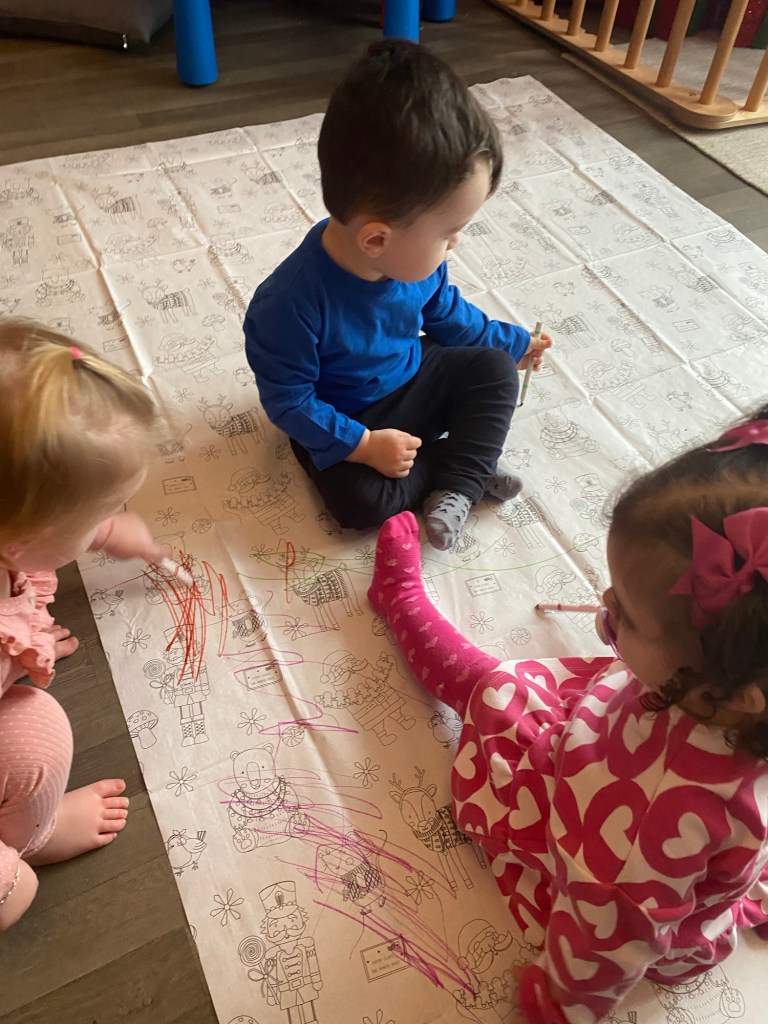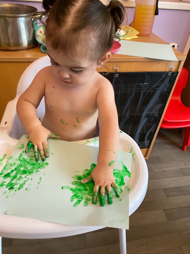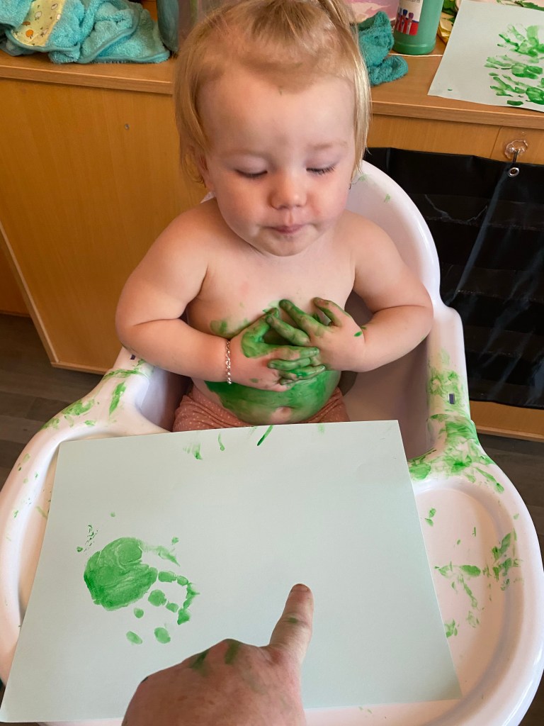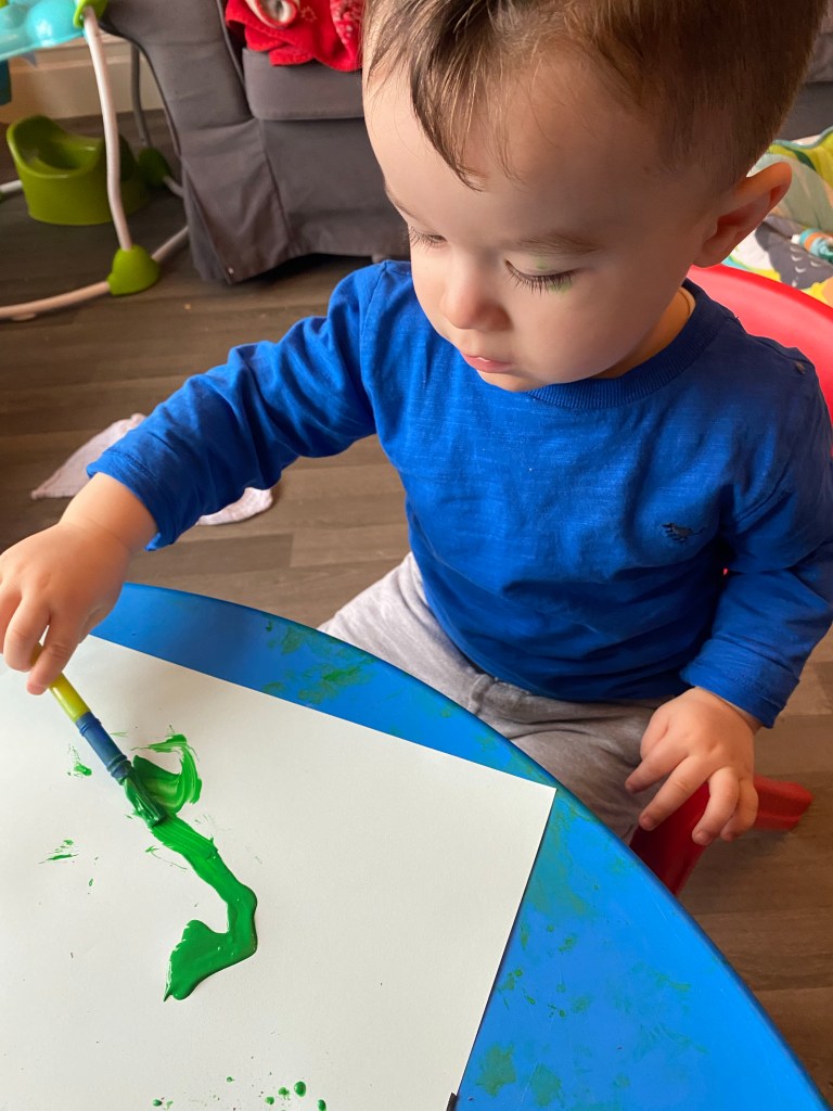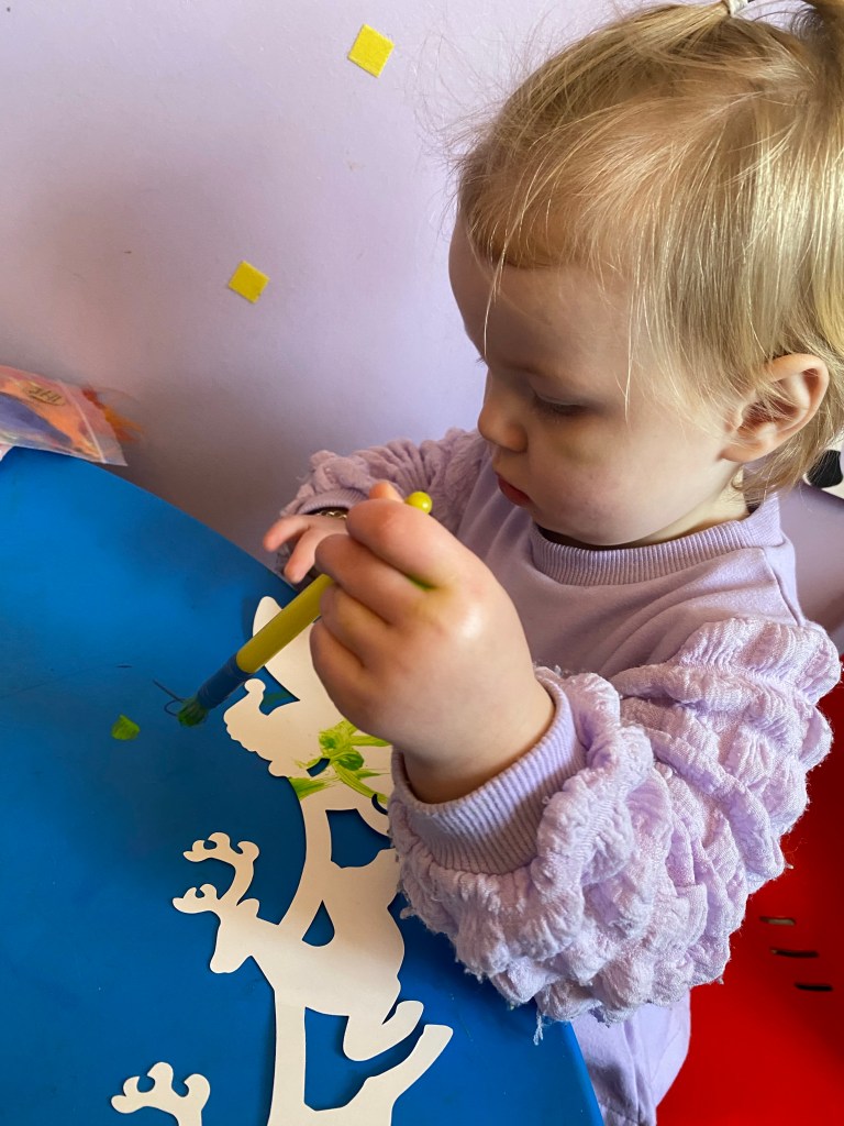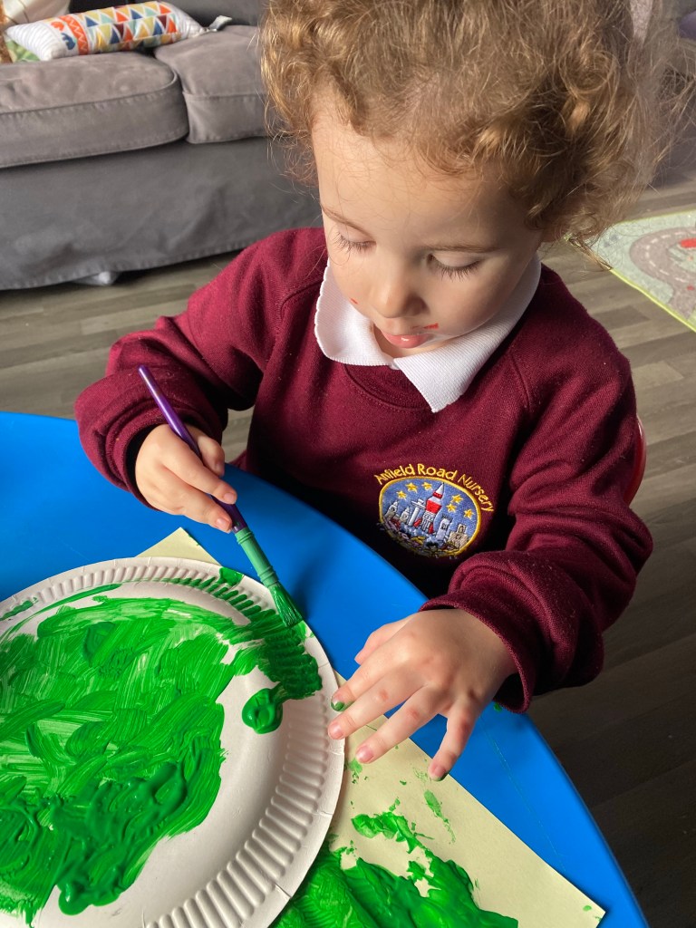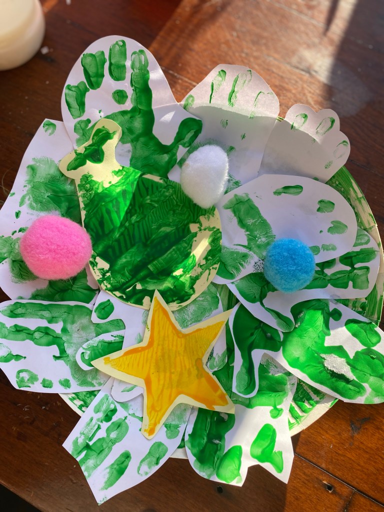We started our crafts by making a Christmas wreath. All the children made green hand prints, except for Elliott, he doesn’t like getting his hands messy. Elliott painted a green picture instead and we cut out shapes to add to the plate.