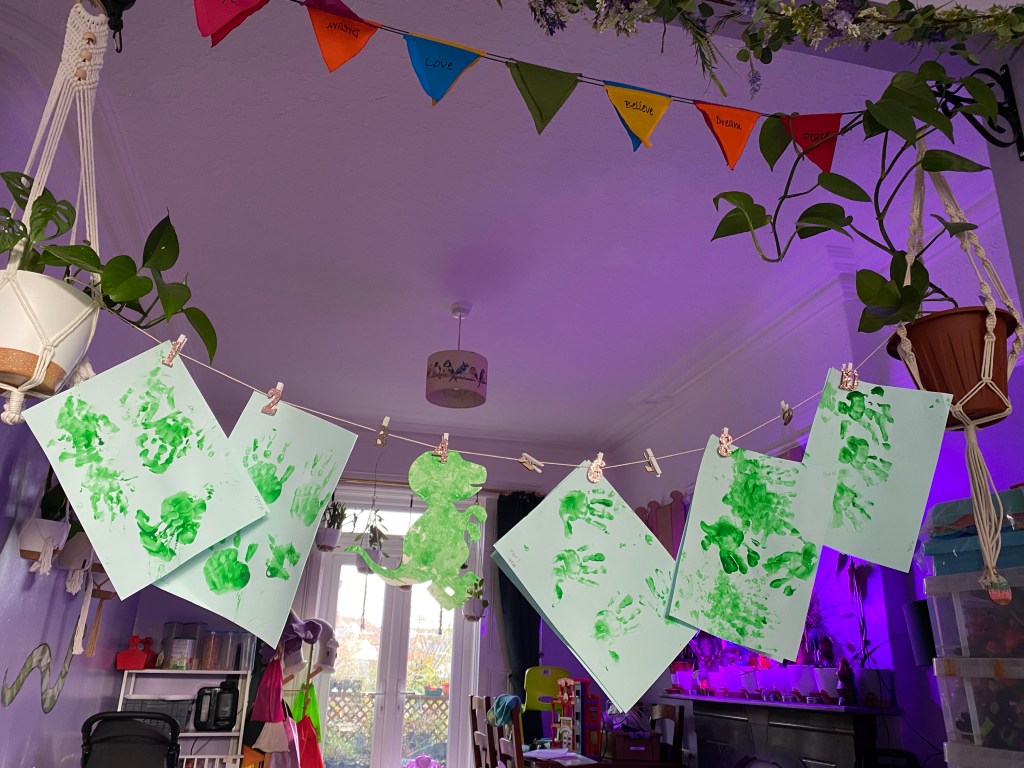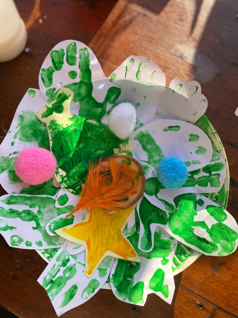 Next we glued the prints onto a paper plate and added glitter, sparkly paper and various other pretty shapes. Tracie then hung them up to dry. We displayed them on the window for everyone to see.