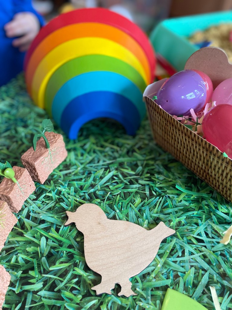 We put together a tray of colourful items that we think of when talking about Easter time. We added a rainbow because the weather is rainy and sunny. We added a plant lifecycle so we could see how a plant grows from a seed to an adult plant.