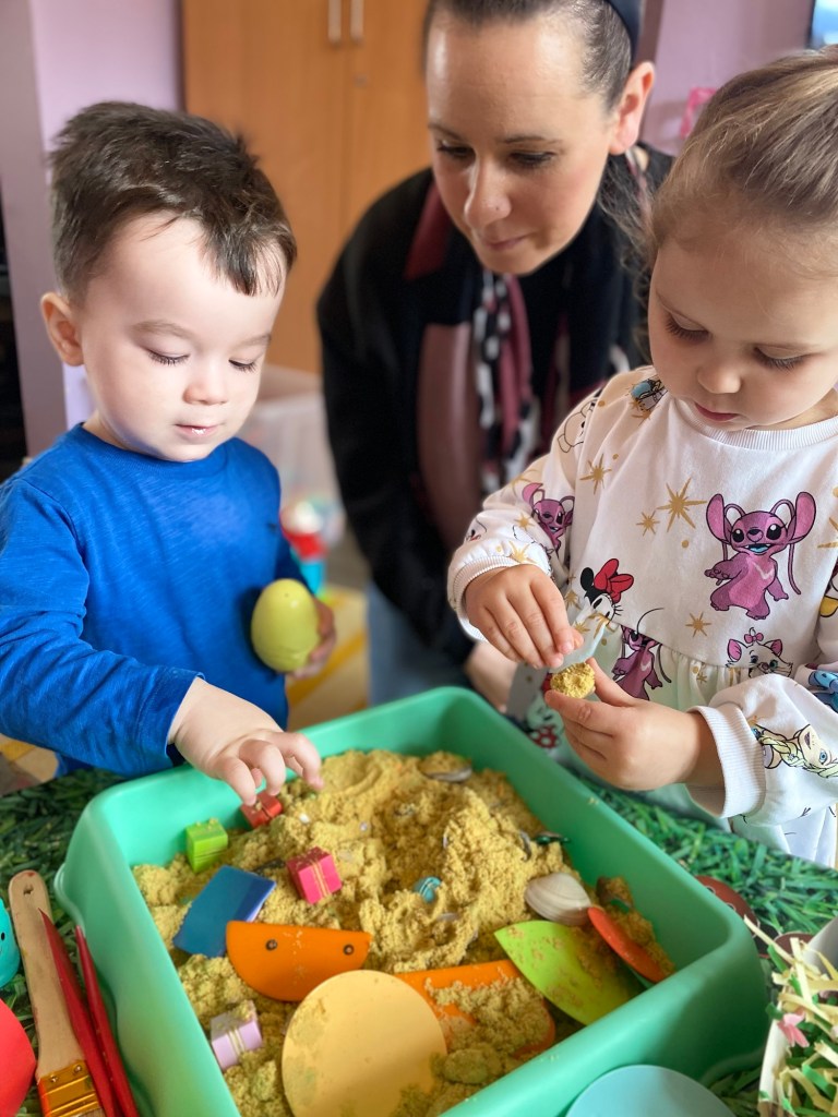 Alba and Elliott played in the sand, digging for hidden eggs. They found other Easter shaped craft items such as pastel coloured shapes, flowers and stencils .