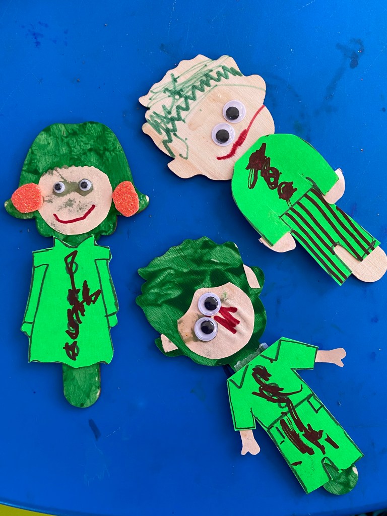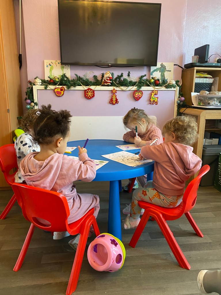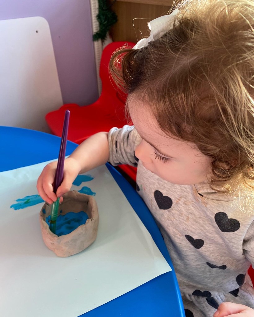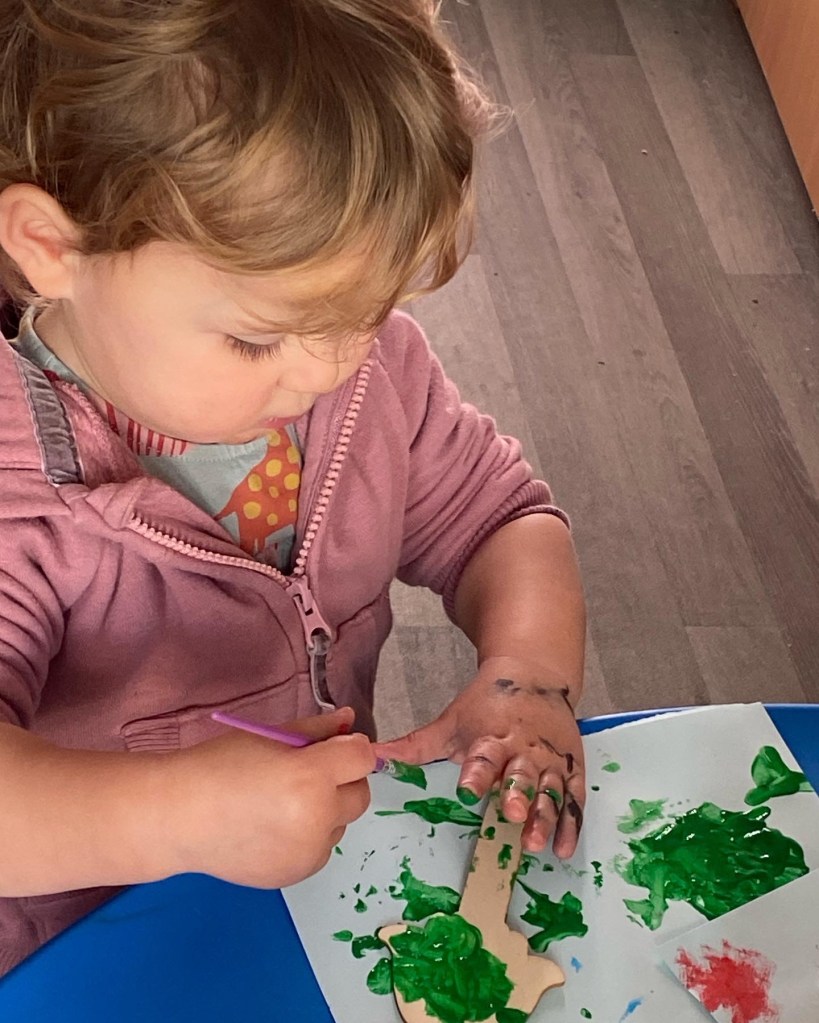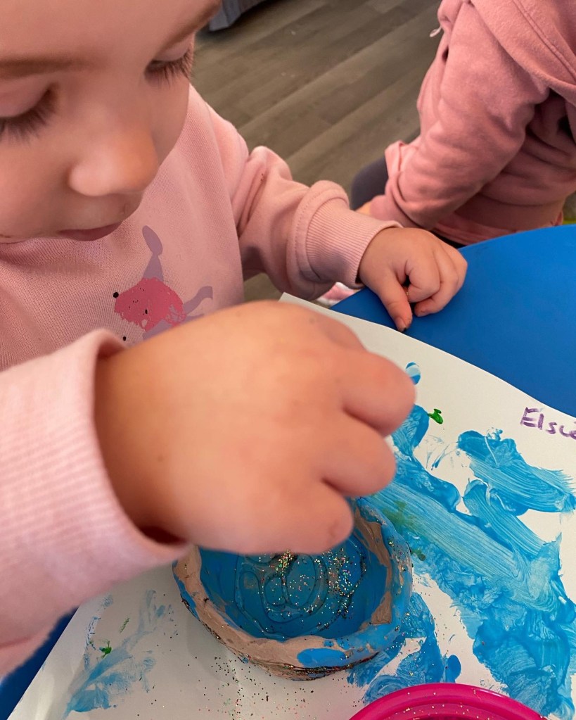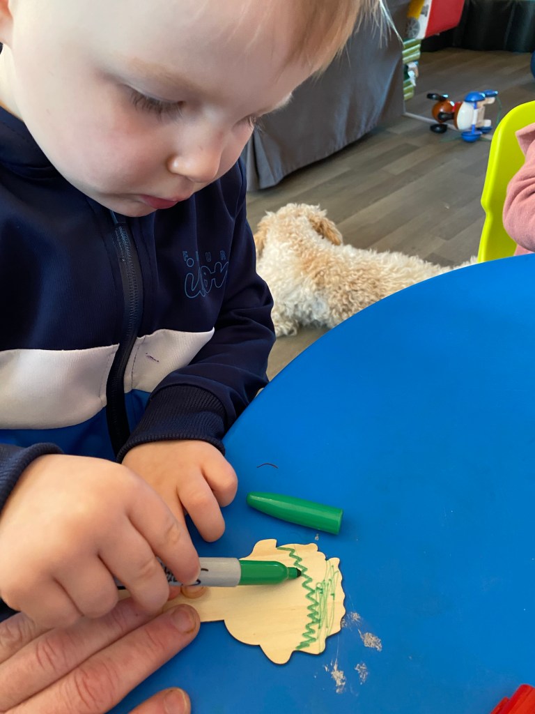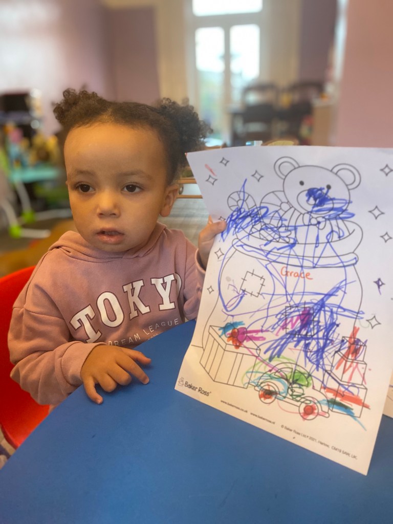 Georgia loved playing with the Ello bricks and shapes. She made a lovely flower garden. She also made lots of crafts, this one was a pre printed princess dress, hair, shoes and gloves. Georgia then had to draw the princess’s face and join the arms and legs. It was so good she wanted to display it on the wall and make another one to take home. Georgia was so clever writing her full name on the top of the picture all by herself.