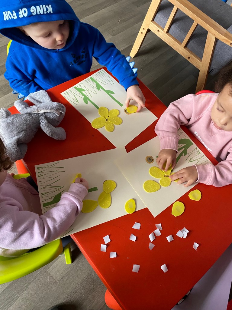 We have been reading the Poem by William Wordsworth about the lively dancing Daffodils, we decided to make beautiful pictures of them for a display to brighten up out playroom.