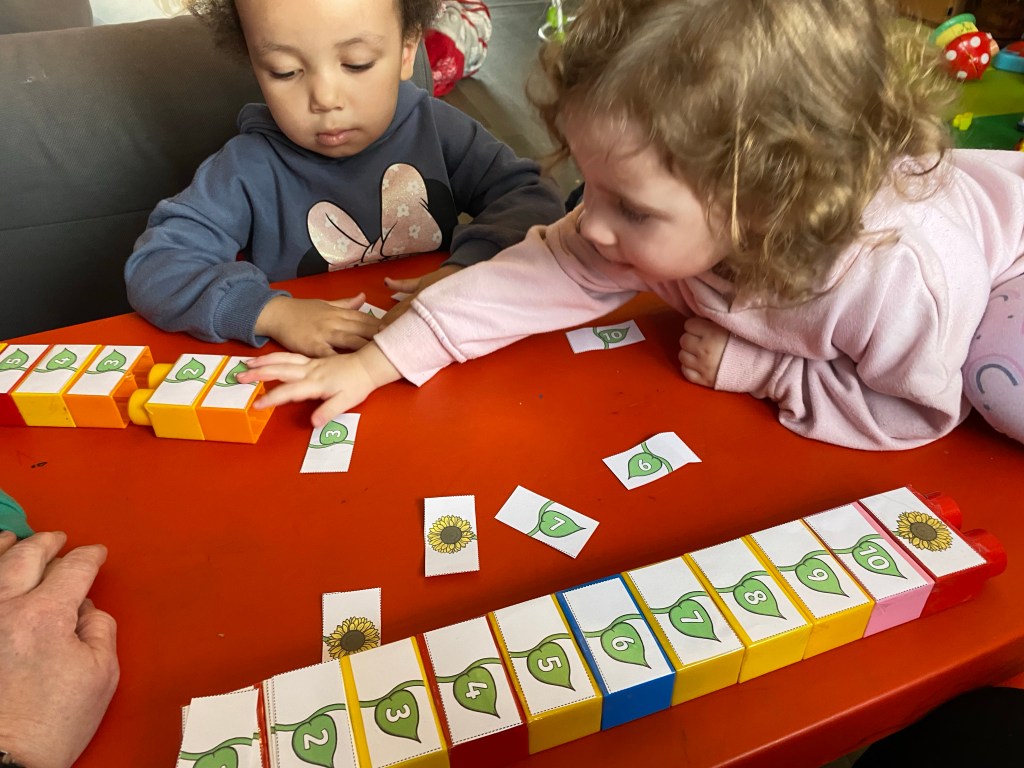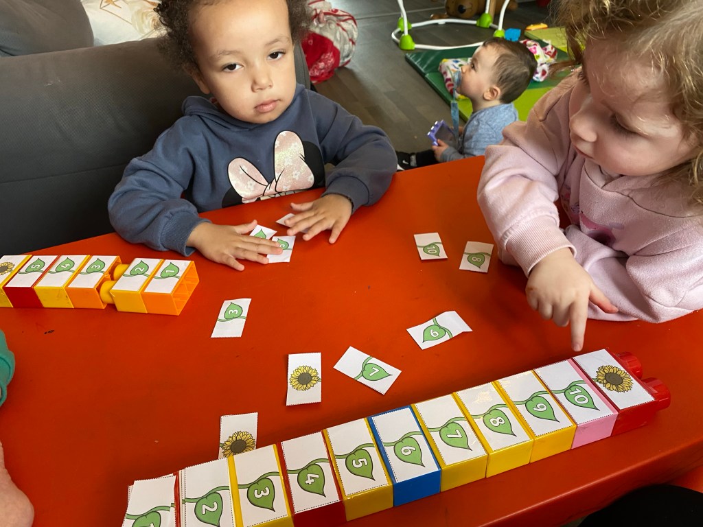 We had fun making number blocks today. We printed off 1-10 sets of leaves and a sunflower head which we stuck onto our big duplo bricks.