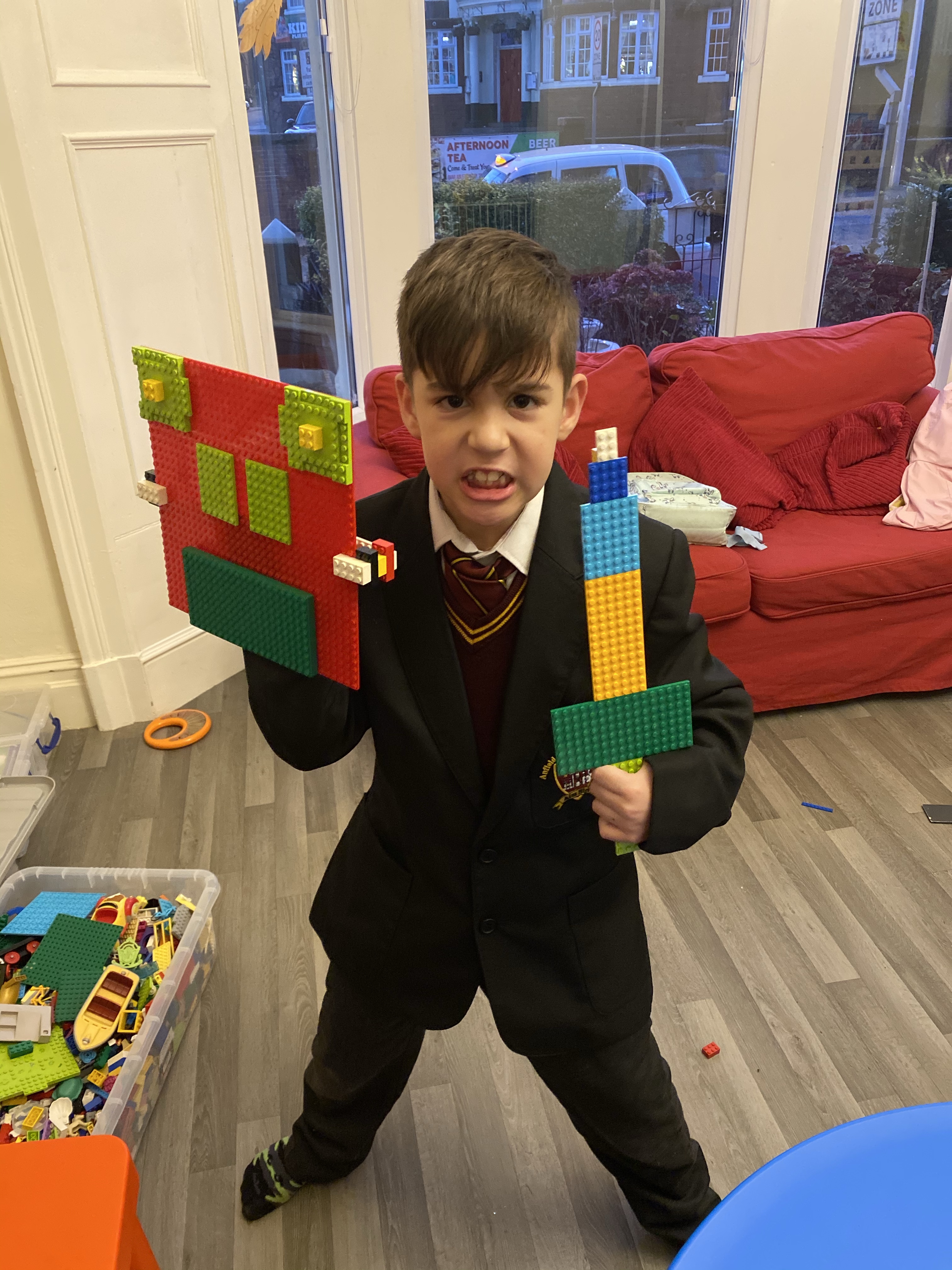 The boys came home from school in a creative mood. Jacey had been learning about Romans in history class, this gave him the idea to make a sword and shield. On his shield he has a dragons face to scare fighters away and a sword for protection. We took a picture and added it to his class twitter page for all to see.
