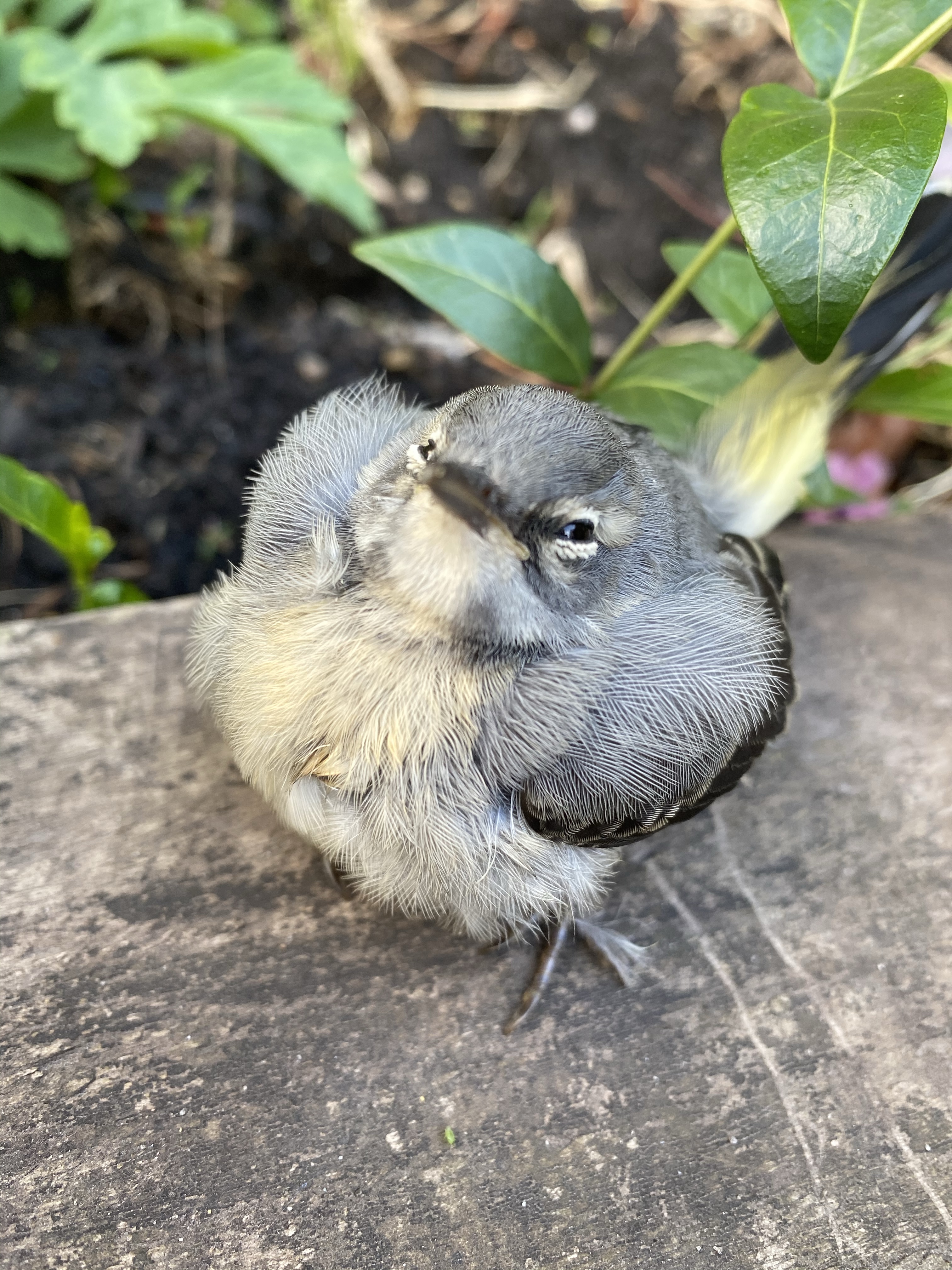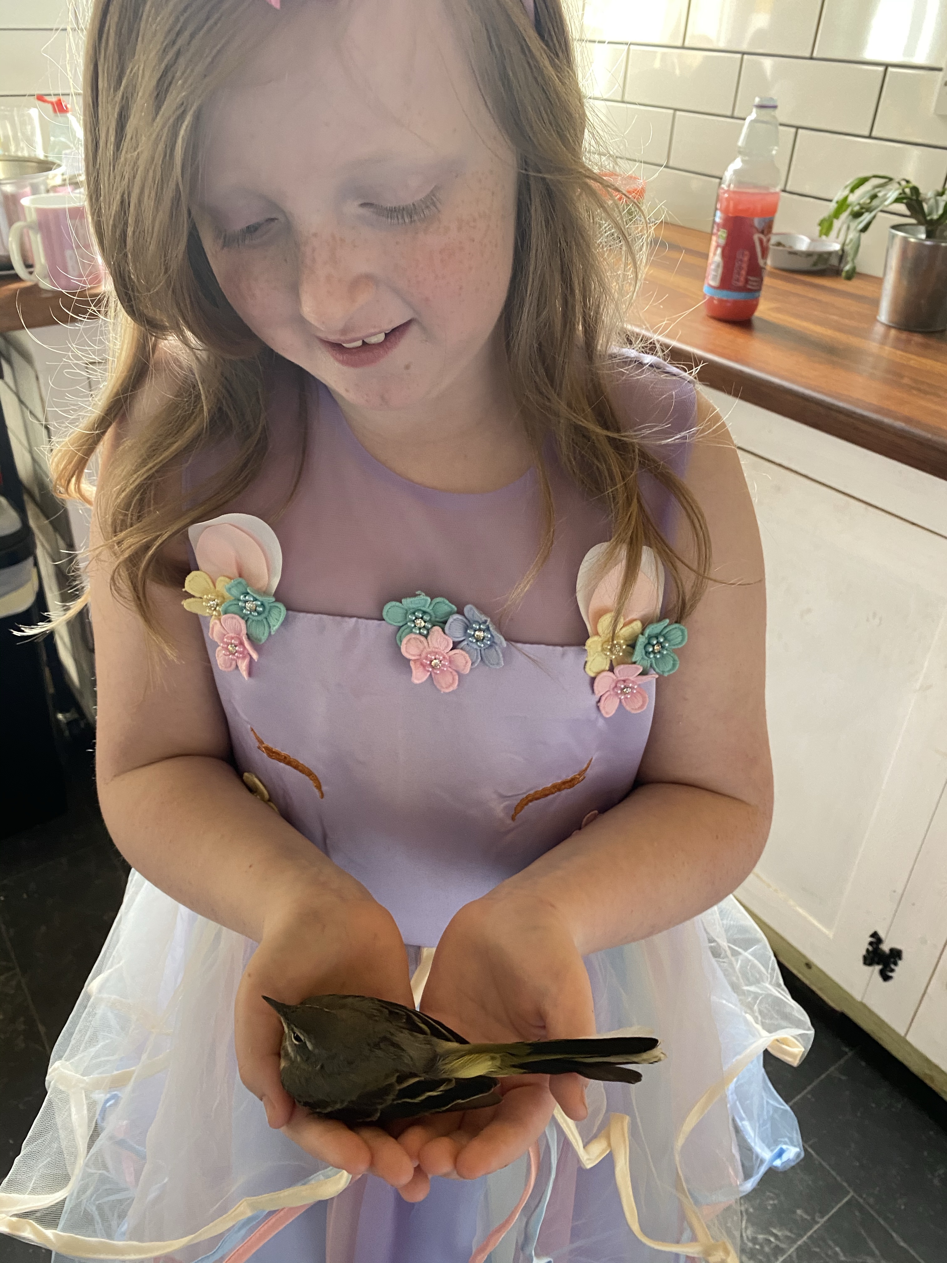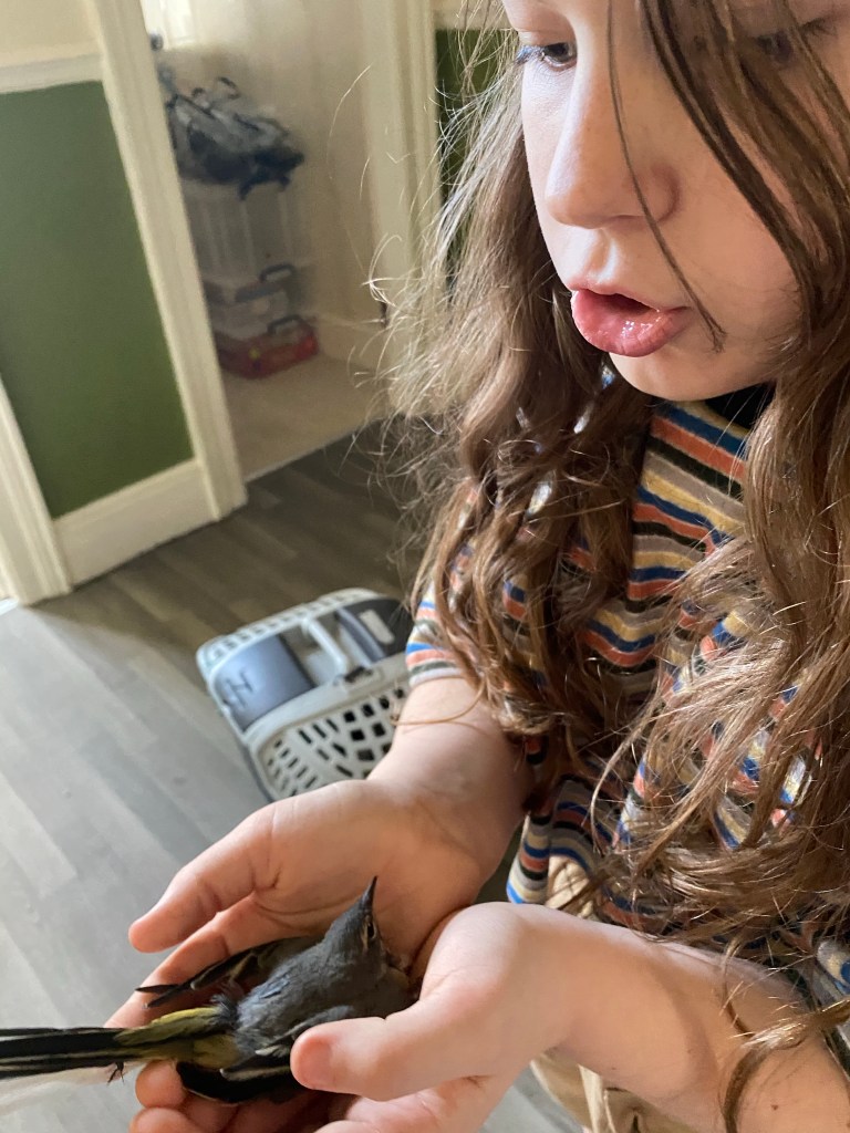One morning while Tracie was putting the washing on the line one of the cats had this baby bird in its mouth. Poppy got upset but luckily we were able to take the bird gently from the cat. We very carefully checked over the bird and decided to put it on the bird feeding table so it’s mummy would find him.