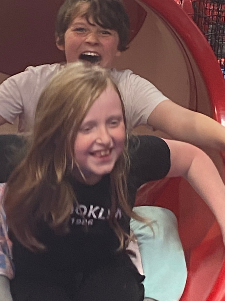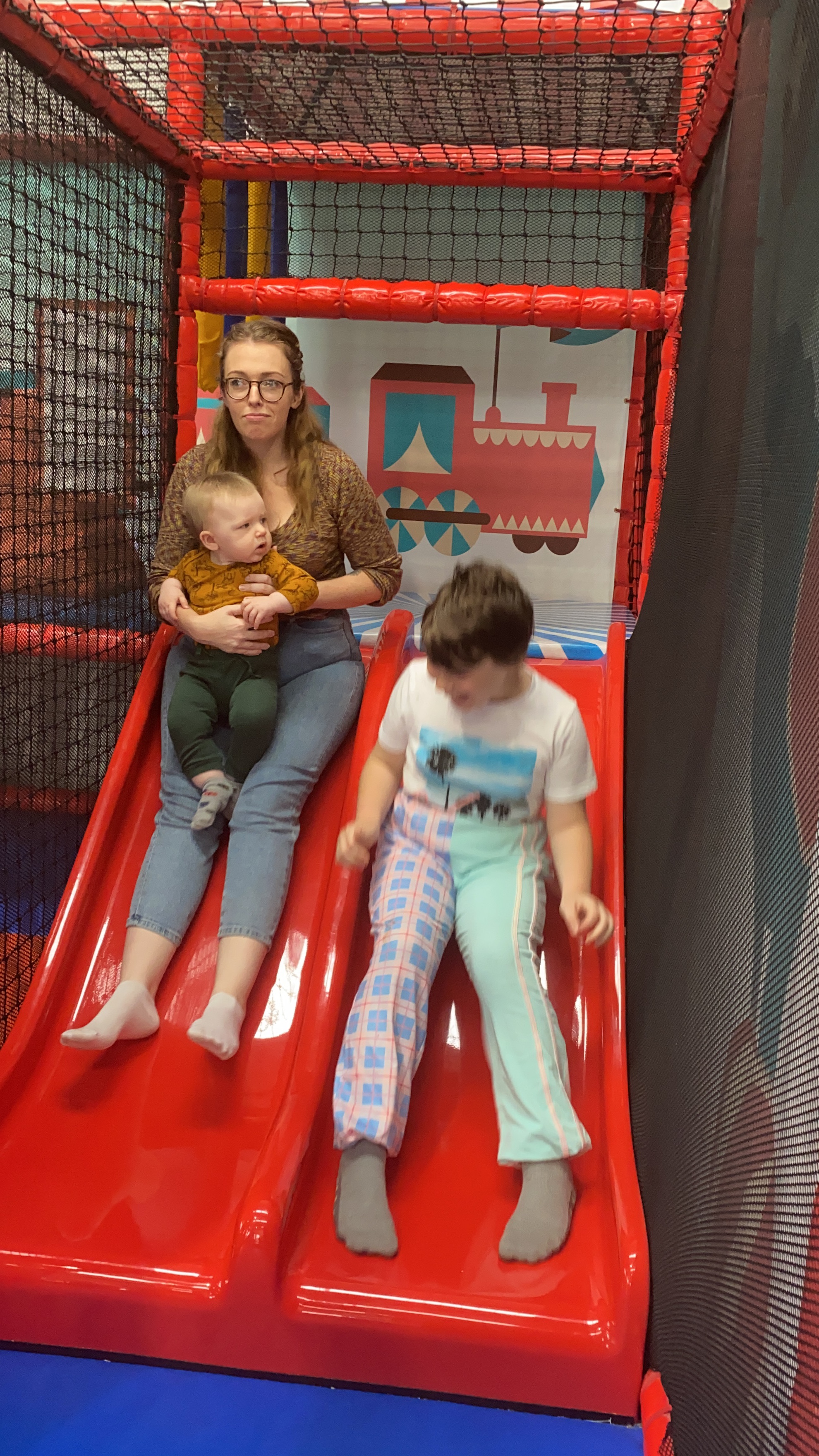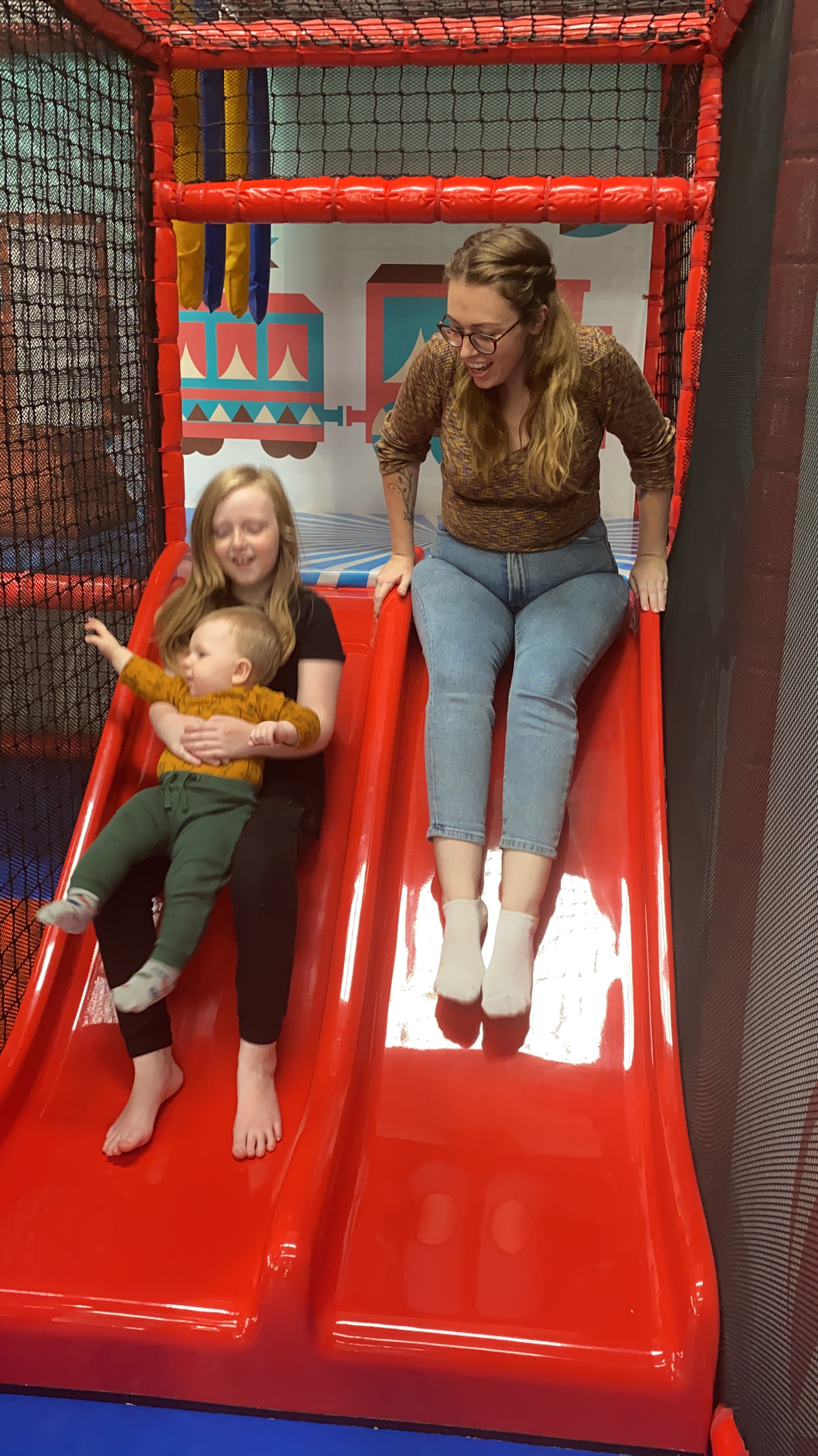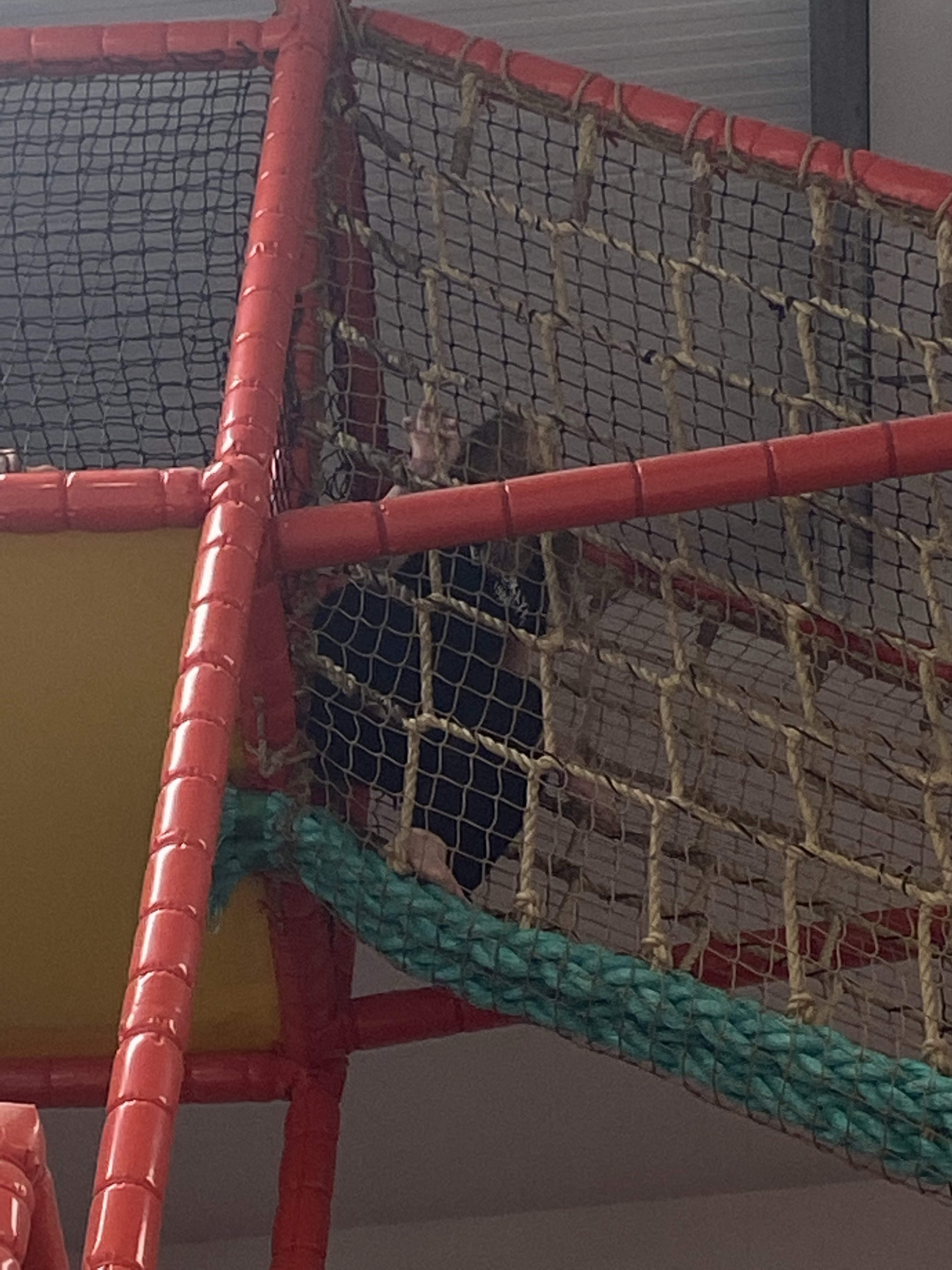Poppy found the way up to the slide very challenging, Gemma and Chloe both encouraged her to have a try. It took about four attempts and quite a lot of screaming but eventually she made it up the ropes and down the tube slide!