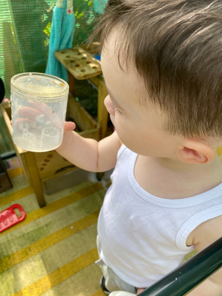 To support the children’s cognitive skills, we provide activities to observe and understand nature through investigation. The children’s favourite activities at the moment are pond dipping and growing and harvesting flowers, fruit, and vegetables. Some of the learning objectives within these activities are linked to lifecycles, categorising, comparison and pattern recognition in nature.