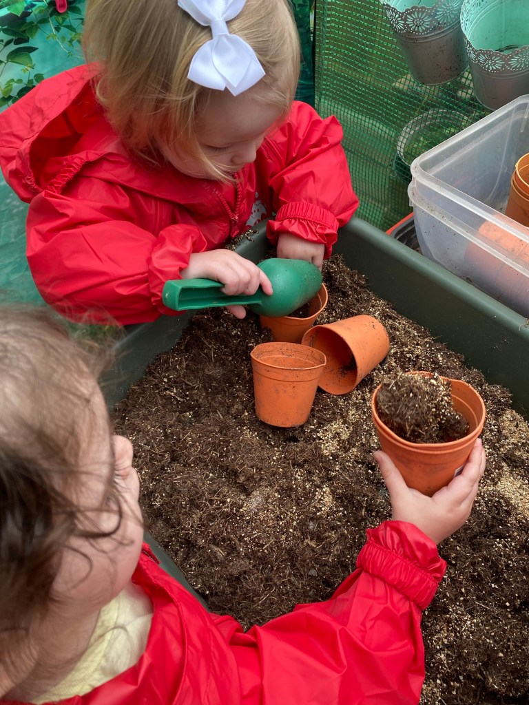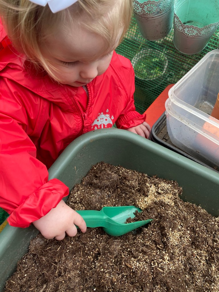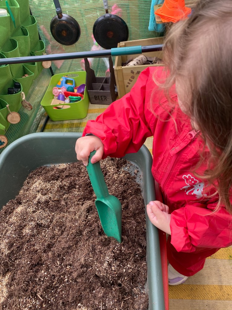 While in the outdoor area the children listen to natural sounds and explore other sensory experiences (e.g., the rustling of leaves, the feel of mud and sand) this broadens and enhanced language development by using words such as squidgy, squelchy, scrunching.